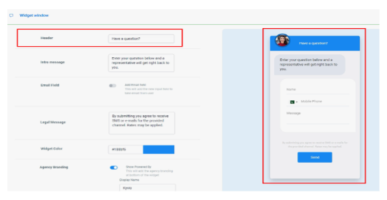 The first item on the list is the header, which represents the questions visitors may have. Following the header, there is an introductory message. The paragraph provided “Enter your question below and a representative will get right back to you” will serve as the introductory message.