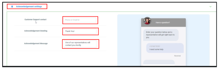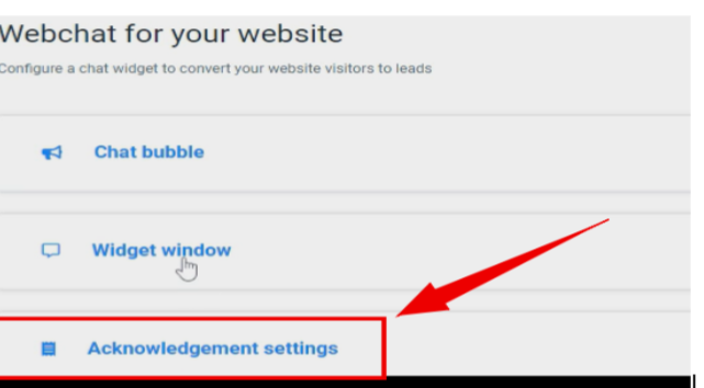 After Chat bubble and Widget window, the Third step is the Acknowledgement setting.