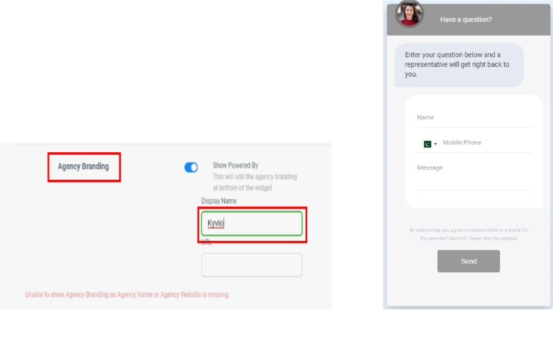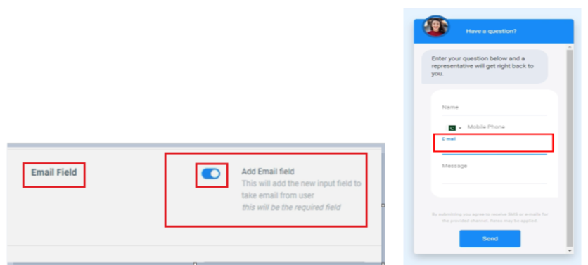 The next is the email field with an Enable/Disable option having heading “Add Email Field” Next, in the legal Massage By submitting the form, you are consenting to receive SMS or email communications through the provided Channel. Please note that charges may apply for these services.