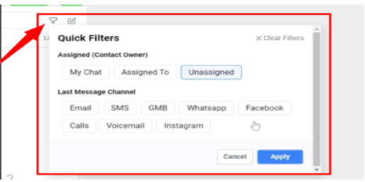 Inside the filters, you can customize your conversation view similar to an email inbox. You have options to filter messages based on various criteria, such as specific keywords mentioned in the replies or if they are assigned to you or your partners. Once you select the desired filters, you can apply them, and the conversations that meet the criteria will be displayed.