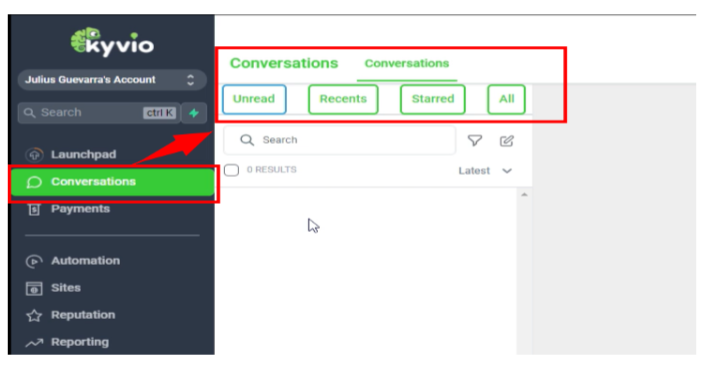 To access your Kyvio account, log in and go to the Conversations tab on the navigation bar. There, you'll find an inbox that captures all customer emails. You can easily view and respond to their queries within the system. The inbox is organized into four tabs: "Unread," "Recent," "Starred," and "All," which help you manage conversations efficiently. With just a few clicks, you can initiate professional email correspondence with your customers, improving communication effectiveness.