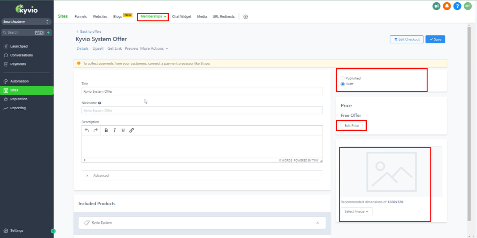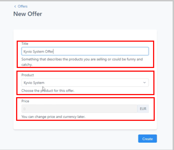 Once your course is created, you can effortlessly proceed to the 'Offers' section and craft an enticing offer for your specific product. To do so, simply enter a captivating and distinctive offer name like "Kyvio System Offer" into the Title box. Then, provide the product details and specify the price in the dedicated column. Finally, click the "create" button to finalize your offer.