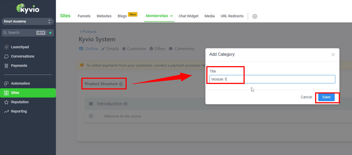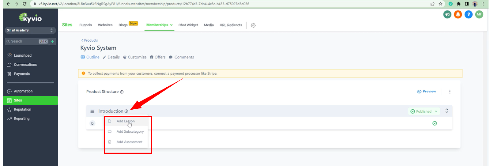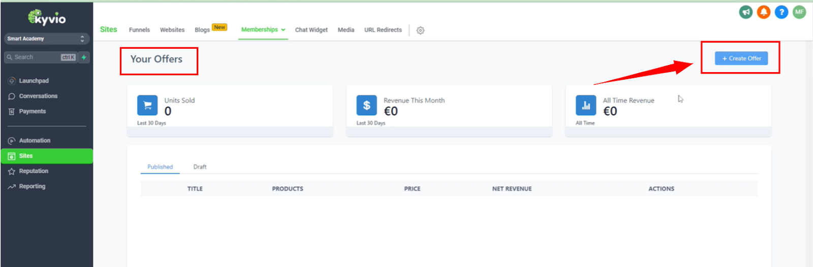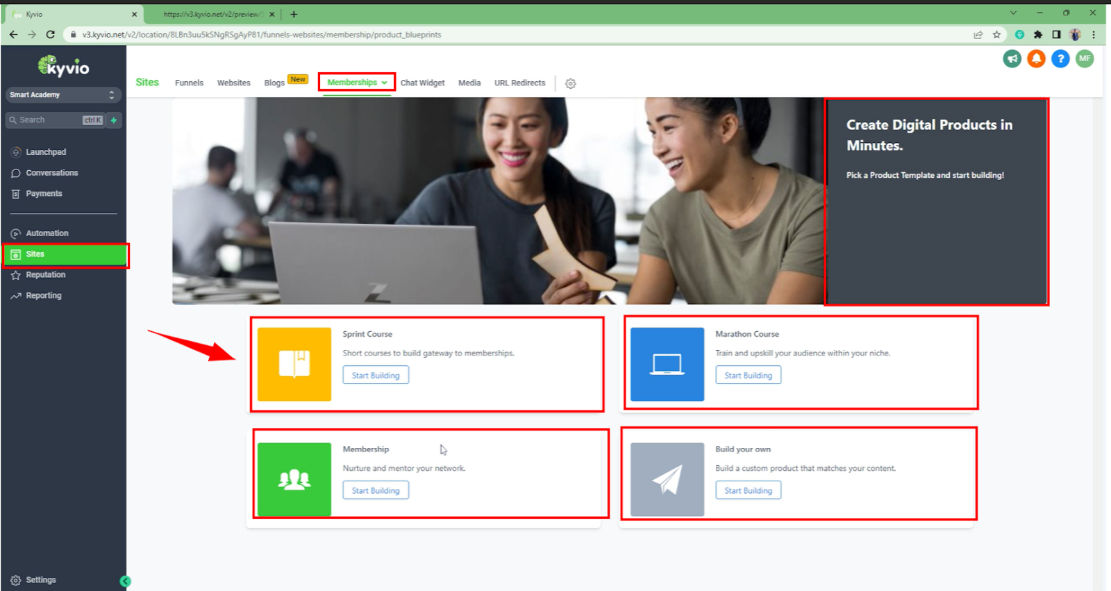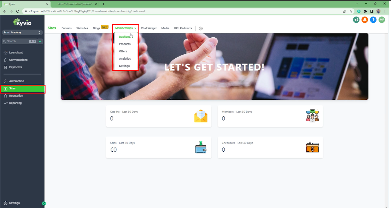 Membership inside Kyvio is an exciting feature that can help take your business to new heights! With Kyvio's membership system, you have the power to upload and share your valuable courses easily. You can effortlessly create and customize your membership, setting everything up just the way you want. Plus, you have the flexibility to craft enticing offers for your courses, ensuring that your audience gets the best value. So, go ahead and make the most of Kyvio memberships to enhance the quality of your course and provide your audience with an exceptional learning experience. Then, let's move forward and select the sites from the side navigation bar. After that, click on the membership dashboard. Now, go to the Products section, where you will have the opportunity to create your very own course
