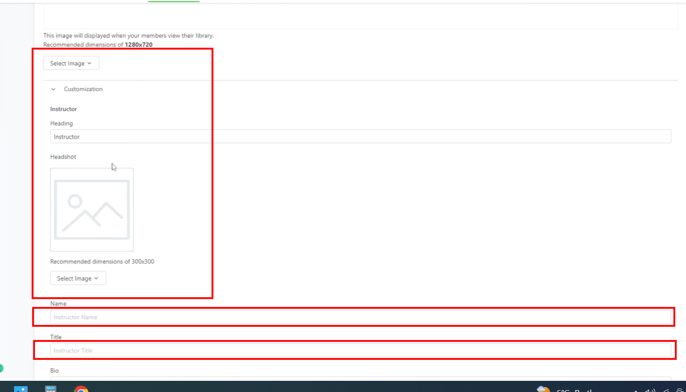 In the customization section, you have the option to upload a picture and a headshot. You can choose a name for your instructor. You can also include their bio if desired.