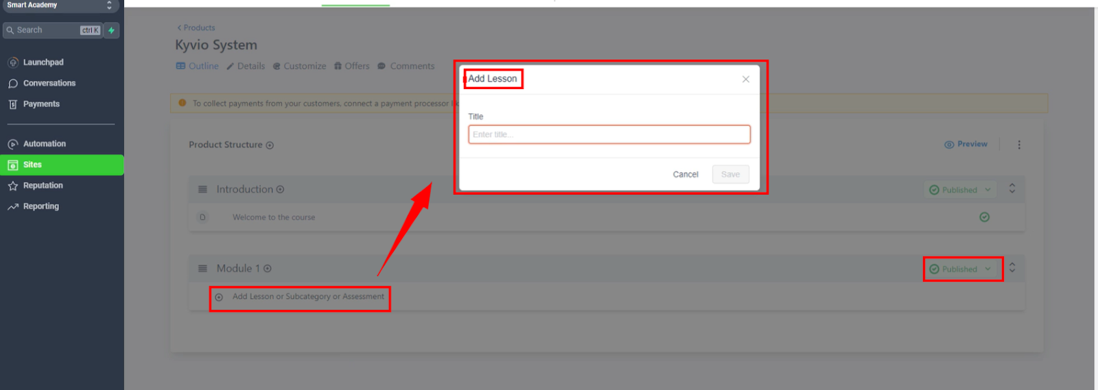 After completing the previous steps, you can navigate back to the main page and check the current status. In this case, since it is the first lesson, it will be displayed accordingly. Now, if you wish to create a module 1, you can simply click on the "module" option provided. This action allows you to create a category for the module.