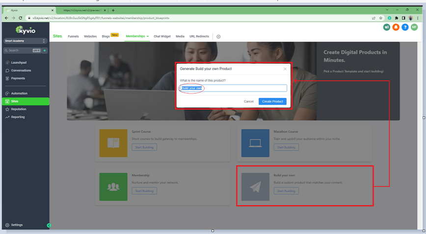 On the other hand, if you prefer to build your course from scratch, you can simply click on the "Start Building" button labeled "Build your own." From there, you can give your product a personalized name that aligns with your course, and then proceed to hit the "Create" button.