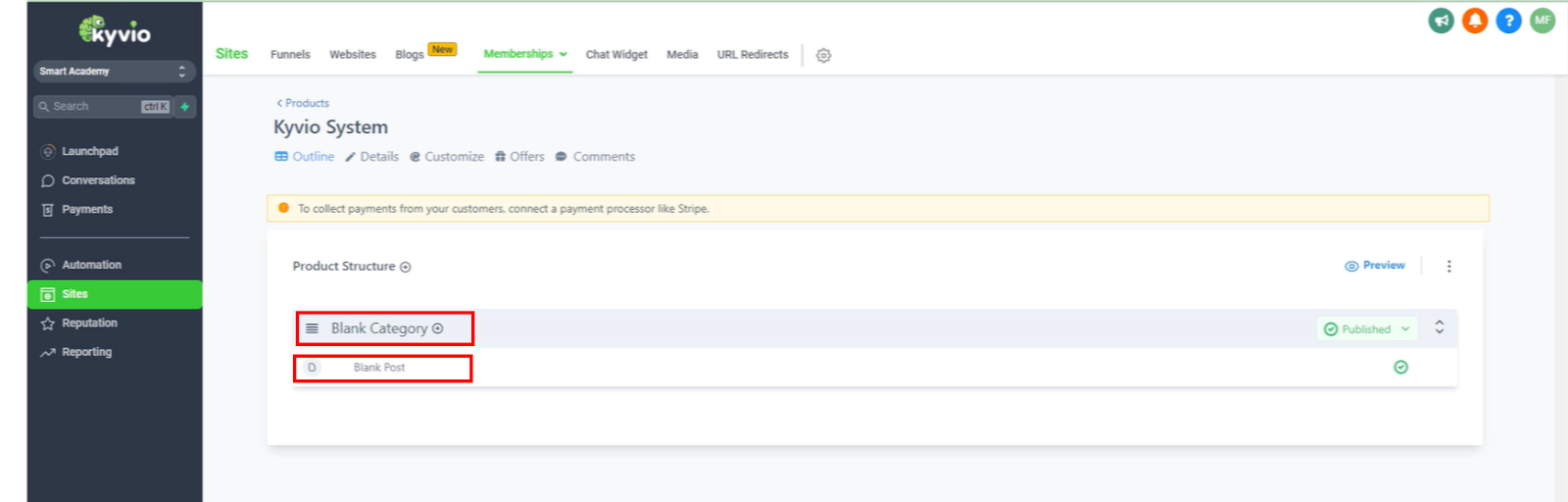 After successfully creating your course, you will be taken to the membership builder interface. Here, you have the freedom to create categories, subcategories, upload your lessons, and customize them to enhance their visual appeal. In the provided image, you can see the outline where you will establish your categories and add all the necessary lessons. With the product structure feature, you have the flexibility to organize and structure your course in a way that suits your needs.