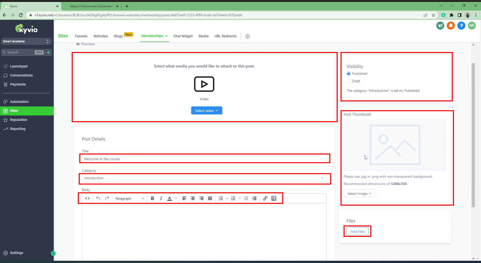 In the "Post Detail" you have the option to give a title to the video. For example, you can use the title "Welcome to the Course," as shown in the amended image. Additionally, you can write the description in the designated area. Furthermore, you have the ability to add files such as PDFs, documents, and Excel spreadsheets. Additionally, you can include a thumbnail or poster image for the video. Finally, you can click on the "publish" button to make the post visible to others and then hit "save" to retain the changes made.