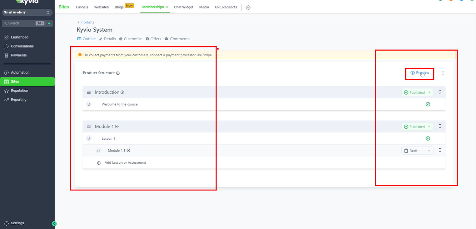 After you have finished creating your course and adding lessons, you can easily preview how it will appear to your students by clicking on the "preview" button. This allows you to visualize how your course will look and make any necessary improvements. This feature helps you ensure the overall quality of the course. You can identify and rectify any areas that may require refinement, resulting in an improved learning experience.