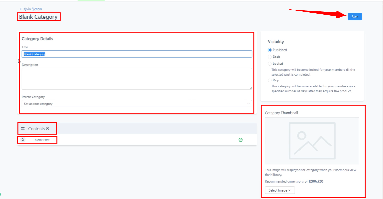 In the previous image, we can observe that there was one category and one lesson. To modify the category label and make it "Introduction," you can simply click on it and replace the existing text with "Introduction" in the provided blank space. Additionally, if you wish, you can enhance the visual appeal of the category by adding a thumbnail. Once you have made the desired changes, you can save your modifications by clicking the "Save" button.