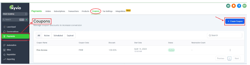 In the “Coupons” tab, you can create a new coupon to offer a percentage discount on special deals. Simply click on "Create New Coupon" to get started!