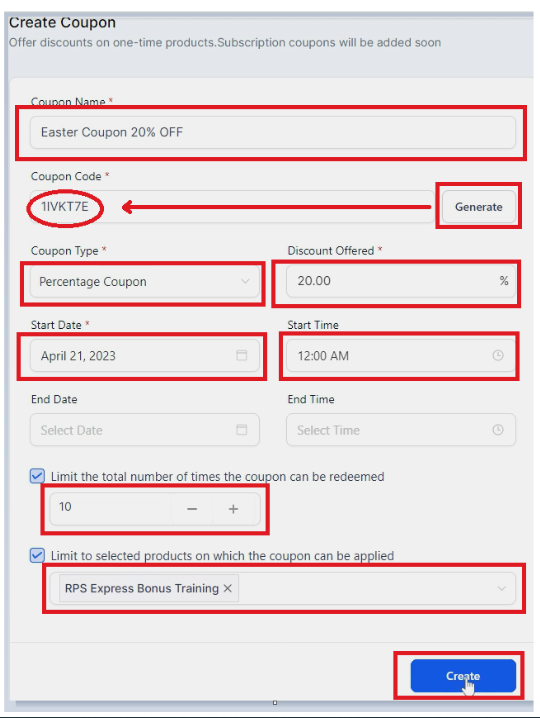 When you click on "Create Coupon" in the Coupons tab, a new area will appear where you can input the necessary information. It is important to fill in the highlighted boxes with the relevant details, by considering the given points below: