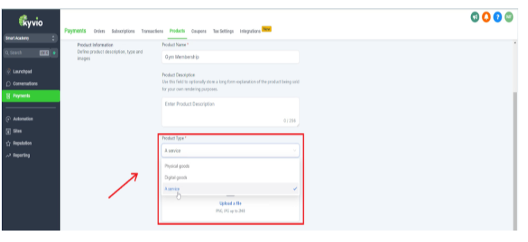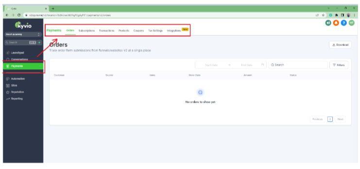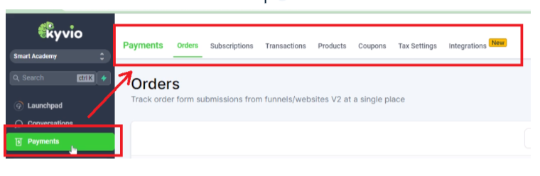 The next heading in the navigation bar is "Payment". By selecting this tab, you can conveniently manage your payments within the Kyvio system. When you click on the payment tab, you will have access to various navigation bars, such as "Order", "Subscription", "Transactions", "Products", "Coupons", "Tax Settings", and "Integration".