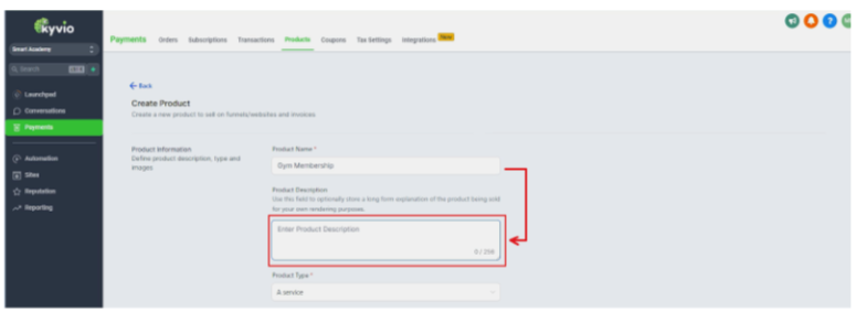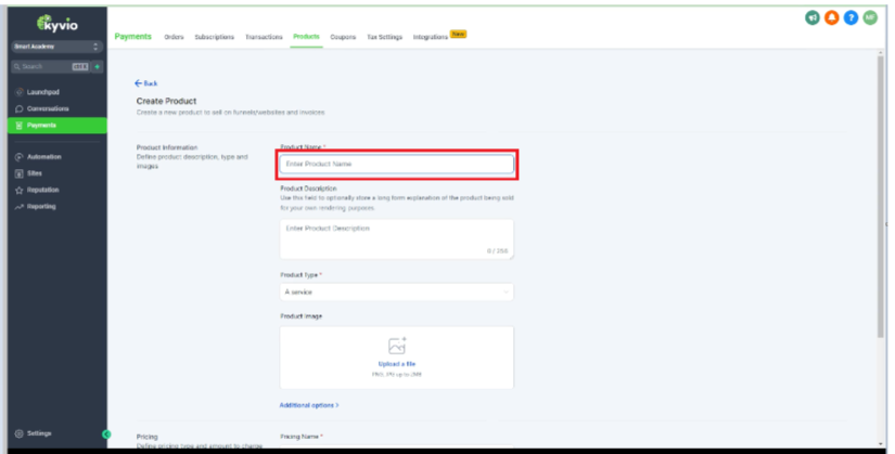 When you navigate to the page, you will find a range of blank fields awaiting your input. In the "name" field, you can provide the specific name of the product you wish to create. As an example, let's consider a gym membership.