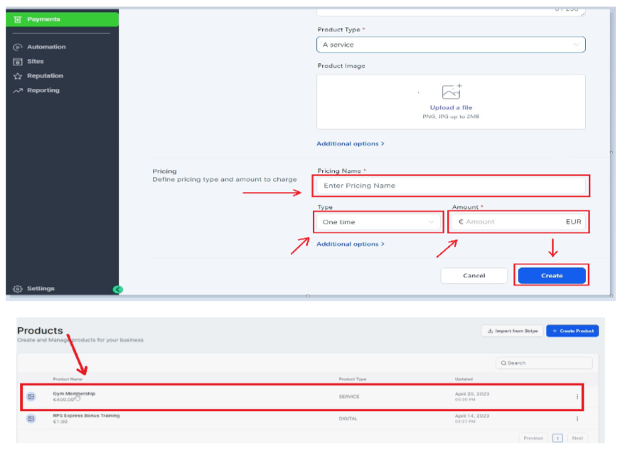 Additionally, you can give the product a pricing name, which can be the same as the product name. You can simply copy and paste it into the appropriate field. Furthermore, you can choose the type of product, deciding whether it will be a recurring subscription or a one-time purchase. The choice is up to you based on your preferences. If it is a recurring product, you can specify the price, such as 400 euros per month. Let's say you want to offer it for the next three months, so you can indicate the number of payments needed, which would be three, including the current one. After providing all the necessary information, you can click on "Create" and the product will be successfully created and can be found in your products tab.
