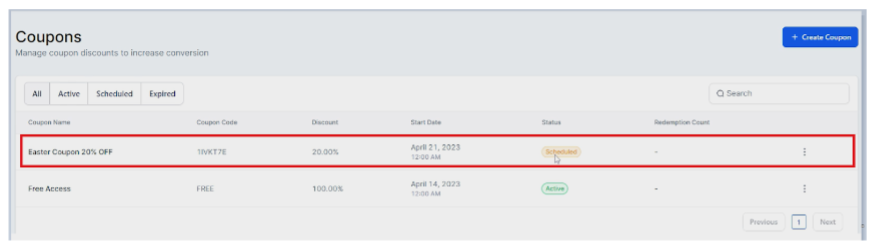Now you can see this created coupon valid from 12:00 AM as scheduled in coupons list.