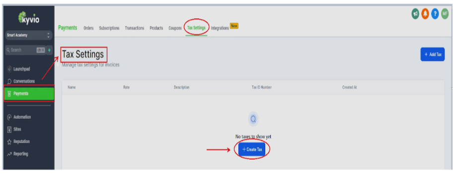 The next step is to configure the "tax" settings. If you want to apply taxes to your customers, you can create taxes from the available options. This allows you to set up taxes according to the regulations in your country and the specific tax rates applicable. These tax settings are essential when it comes to handling invoices. However, since you won't be utilizing the invoicing feature within the Kyvio system and will solely focus on managing products, there is no need to set up tax settings or a tax manager at this time.