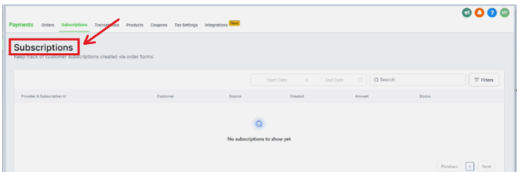 2. Moving on to the "Subscriptions" section, here you will find the curated selection of subscription-based products that you have included in your order form. These products comprise two distinct types: one-time payment items and recurring subscriptions. The latter category consists of recurring services or products that are billed periodically, be it on a monthly, weekly, or bi-weekly basis, among other customizable billing frequencies. As the merchant, you have the flexibility to establish the subscription duration based on your preferences. Consequently, the "Subscriptions" section empowers you to effectively manage and monitor the recurring revenue streams generated by these subscription products, contributing to enhanced financial control and operational efficiency.
