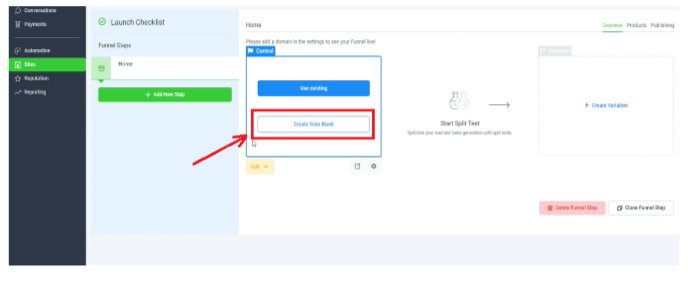 Let's assume you want to create a new funnel specifically for testing purposes. In the funnel, you can add a step by selecting the "Create From Blank" option. This allows you to customize the order of steps according to your preference.
