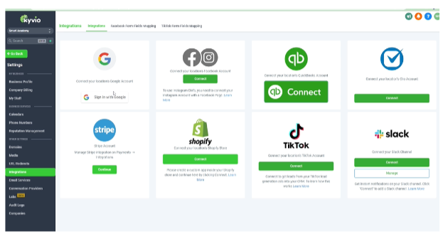 After completing that step, you can head to the integrations section to connect your Google account, if desired. Additionally, you have the option to connect any other available integrations to fully utilize their functionalities. You can experiment and test the main payment gateway within the Kyvio system to determine its effectiveness.