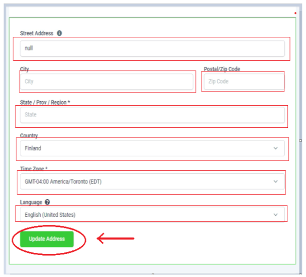 Next, you will need to provide your business's physical address, including the street address, city, postal code, region, country, time zone, and language. Once you have entered this information, you can click on the "Update" button.