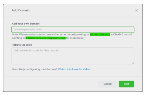 • Once you've added both the A and CNAME records, revisit your hosting settings and enter your main domain (e.g., domain.com) and click "Add." Select your funnel or desired destination for the domain.