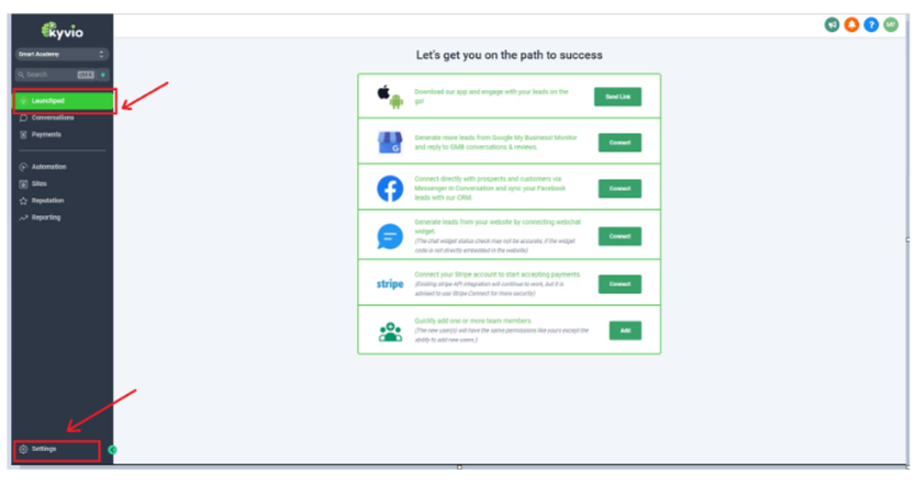 Introducing Kyvio, a powerful business platform that will take your business to new levels! By signing up, you'll unlock access to an exceptional CRM, your ultimate hub. Inside the CRM, the launchpad will be your starting point. Simply head to the settings option at the bottom of the launchpad to easily set up your profile.